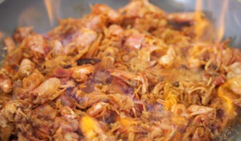 1. Очистить мясо креветок от панциря. Налить в сковороду четыре ложки оливкового масла, положить головы и панцири креветок. Жарить их, придавливая головы деревянной лопаткой, чтобы из них вышел весь сок. Добавить коньяк и фламбировать (Фламбировать значит полить алкоголем и поджечь. Фламбирование применяют только для готовых или доведенных до полуготовности продуктов. Нужно дождаться, пока огонь потухнет сам по себе. Это произойдет, когда весь алкоголь сгорит. Останутся только вкус и аромат коньяка). Будьте очень осторожны. Добавьте молоко. Когда молоко начнет кипеть, снимите его с огня, накройте крышкой и дайте настояться в течение пары часов. Через два часа процедить, придавливая головы и панцири креветок, чтобы они отдали молоку весь свой вкус. Отставить.