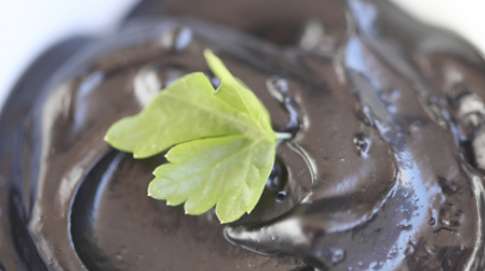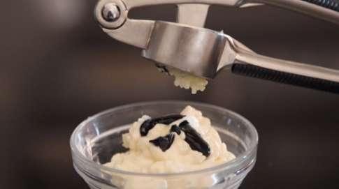 После того, как майонез образует однородную массу с чесноком и кальмаровыми чернилами, добавьте в соус ложку Оливкового Масла, которое придаст ему необычайно привлекательный блеск.