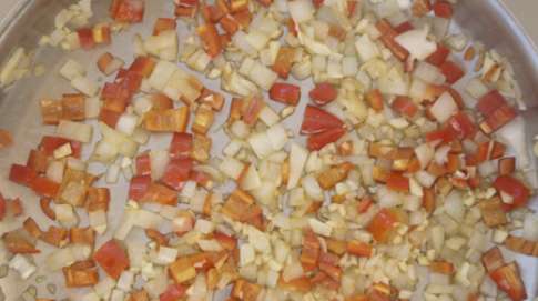Влейте в низкую кастрюлютонким слоемОливковое Масло и потушите перец, лук и чеснок, нарезанные методом «брюнуаз».