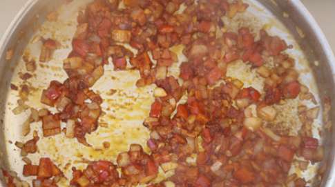 Когда смесь начнет приобретать нежный блеск, добавьте соус из томатов и поджаривайте в течение нескольких минут.