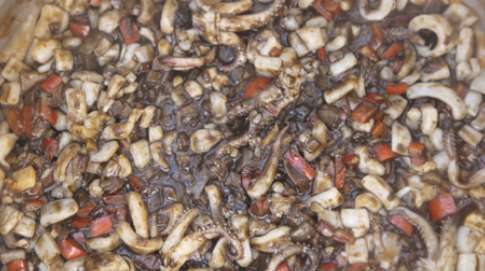 Возьмите несколько щупальцев и колец кальмара и поджарьте их на сковороде на Оливковом Масле: они понадобятся вам для того, чтобы в самом конце готовки украсить это великолепное блюдо.